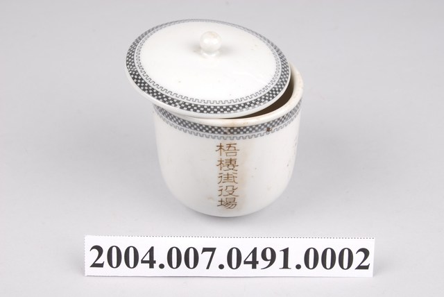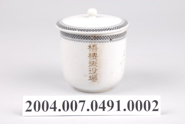 1.本物件為紀念杯(清水梧棲街役場),除了杯子本身之外,更附有茶杯蓋,材質屬於白瓷,杯身上一面有文字(黑字)「梧棲街役場」,另一面則為藍字「堅忍持久」,杯身(杯口)與杯蓋邊緣上皆有磚塊形花紋,杯蓋中心有圓形凸起,便於拿取,整體瓷杯屬於敞口短圈足式。大正9年(1920),地方行政區域改為州郡制,原大甲廳改為大甲郡,下轄下轄清水街、梧棲街、外埔庄、大甲庄、大安庄、沙鹿庄、龍井庄、大肚庄,杯身所指之「梧棲」,即為大甲郡下的梧棲街,梧棲街役場則為現今所指鎮公所。