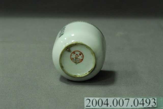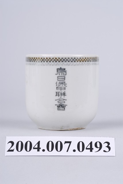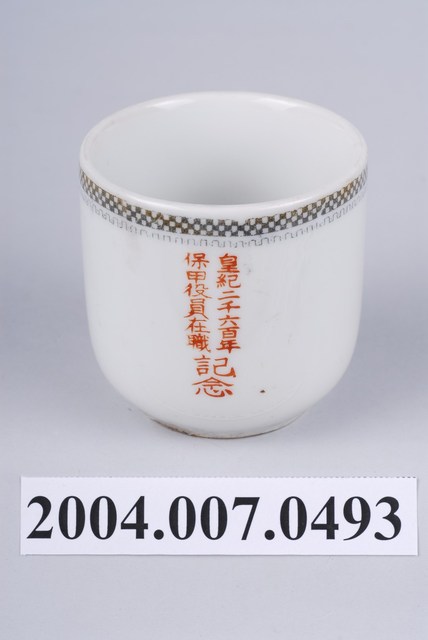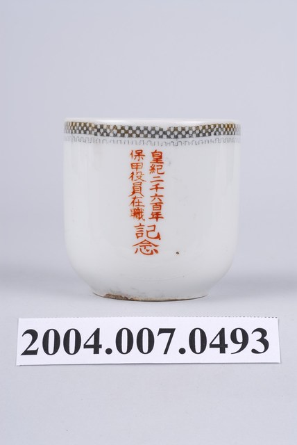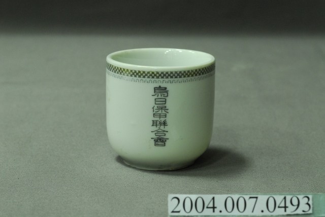 1.本物件為烏日保甲聯合會紀念杯,無杯蓋,杯身一面有紅字「皇紀二千六百年保甲役員在職記念」,另一面為黑字「烏日保甲聯合會」,杯緣有黑色格子,杯底有「台十九谷」等字,應為燒製陶器之處。整體杯具為單一釉色的白釉彩,除為字外無圖樣,屬敞口、圈足、窄底造型,茶杯有污垢。