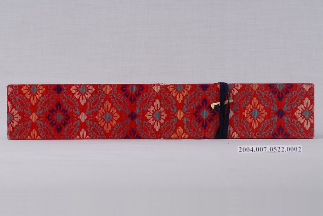本件詩歌畫卡,為畫卡上寫有詩歌的形式。由上下兩緹花布面紙板作為上下底,中間可置放詩歌畫卡,再用細繩綁起。詩歌畫卡共75張,文物保存狀況良好。