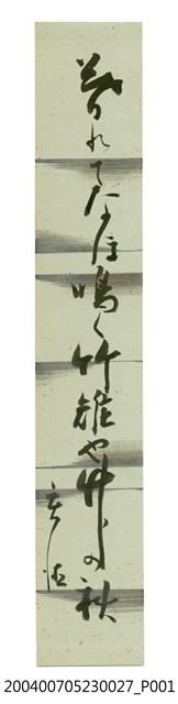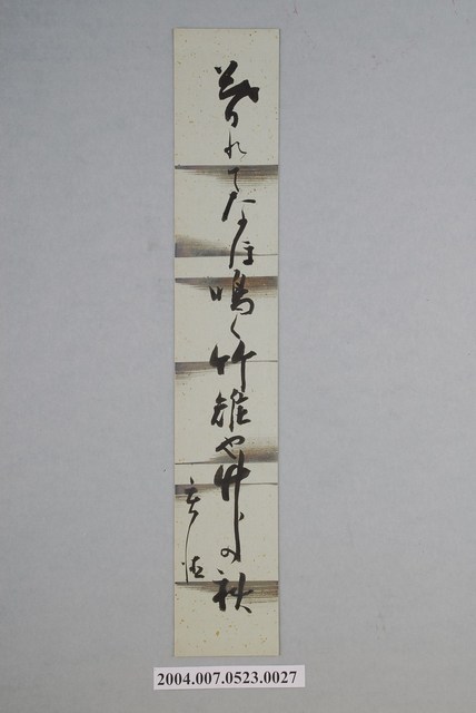 1. 本件為其第27件。本物件所寫之紙質為白金箋。2. 本件原為戴文忠先生所藏日治時期的名家詩集《黃落葉》,為多人撰寫編輯成冊之詩集,內文形式屬於日本文學:韻文,以日文撰寫,本收藏共計53件。日本文學-韻文包含詩、和歌、連歌、俳句、川柳、歌謠以及漢詩等形式。日本文學到了明治時期,自古代傳承下來的詩歌,有和歌、漢詩、歌謠、連歌、俳諧、狂歌、川柳等類別,明治維新之後,漢詩、歌謠、連歌、俳諧、狂歌、川柳等漸被疏遠,詩壇上只盛行和歌(短歌),俳句,和受到西洋詩的影響而產生的近代詩。