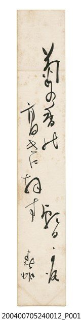 本件原為戴文忠先生所藏日治時期的名家詩集《春陽集》,為多人撰寫編輯成冊之詩集,內文形式屬於日本文學:韻文,以日文撰寫,本收藏共計48件。日本文學-韻文包含詩、和歌、連歌、俳句、川柳、歌謠以及漢詩等形式。日本文學到了明治時期,自古代傳承下來的詩歌,有和歌、漢詩、歌謠、連歌、俳諧、狂歌、川柳等類別,明治維新之後,漢詩、歌謠、連歌、俳諧、狂歌、川柳等漸被疏遠,詩壇上只盛行和歌(短歌),俳句,和受到西洋詩的影響而產生的近代詩。本件為其第12件。