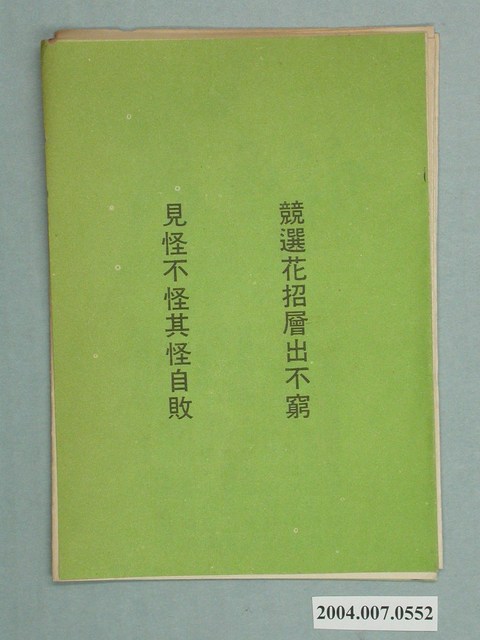 此物件為宣傳小冊,題名為《沉著冷靜迎接選舉》,封底印有「競選花招層出不窮,見怪不怪其怪自敗」字樣,內容以折頁形式刊載14則宣導圖文,揭露候選人所可能採取的各種不良競爭手段,提示選民留意。 臺灣的官辦民主選舉始於日治時期的1935年,而戰後則以1950至1951年的中華民國縣市長選舉為開端。自1950年地方首長選舉開始實施以來,選舉期間候選人「買票」與開票過程「作票」的爭議始終不斷,如:1975年的立委補選中,黨外人士郭雨新於宜蘭參選時便有買票、作票的風波,另外1977年的桃園縣長選舉中的作票行為,便引起「中壢事件」,對此臺灣民間流傳一句諺語:「選舉無師傅,用錢買就有」。