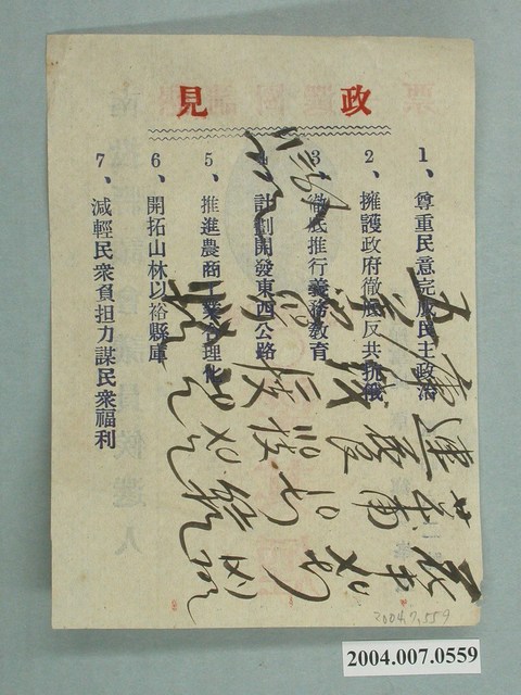 此物件為選舉宣傳單,記載南投縣議員候選人梁其煙的拜票訊息。此宣傳單正面印有候選人相片、號次、姓名及聯絡處地址、電話。傳單背面條列其政見,可見若干手寫字跡,但潦草難辨。此物件的主角為梁其煙,曾任草屯鎮民代表,此為其參選南投縣議員之傳單。 臺灣的縣市議員選舉始於日治時代,在1935年6月臺灣總督府發佈《市會議員及街庄協議會員選舉規程》後,在該年的11月22日舉行全臺第一次地方民意代表選舉,此次選舉,選出的民意代表官選、民選各半,而選出來之議員僅具議決權,不具有提案、質詢等權責。後在國民黨政府派員接收臺灣後,1945年臺灣行政長官公署公布「臺灣省各級民意機關成立方案」,並於1946年辦理間接選舉產生縣市參議員。而在1950年,舉辦了第1屆民選的縣市議員選舉,臺灣民眾得以選出為自身權益喉舌的議員。
