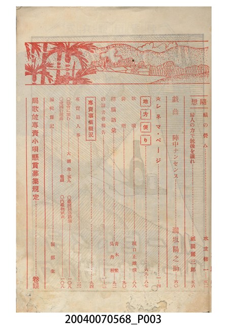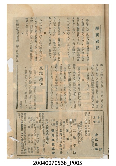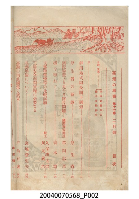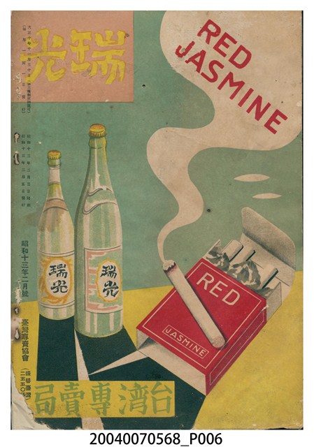 1.本物件為臺灣專賣協會出版《臺灣乃專賣》第17卷2月號,為期刊雜誌,封面為臺灣總督府專賣局之圖像,圖像左側有2架飛機,圖像右側有「2」淡綠色字樣,封面上方有「臺灣乃專賣」黑色字樣,右側由上而下分別有「大正十年十一月三十日(第三種郵便物許可)」、「(每月一囘一日發行)」、「昭和十三年二月三印刷」、「昭和十三年二月五日發行」、「□卷第二百七十八號」黑色小字樣,下方則為「臺灣專賣協會」黑色字樣;封底瑞光品牌之廣告,有2瓶瓶裝酒與1盒菸,其中1支菸已點燃,其菸霧內有「RED JASMINE」紅色字樣,封底左上有「瑞光」黃色字樣,左下有「台灣專賣局」淡綠色字樣,封底左側由上而下有「大正十年十一月三十日(第三種郵便物許可)」、「(每月一囘一日發行)」、「昭和十三年二月三日印刷」、「昭和十三年二月五日發行」、「昭和十三年二月號」、「臺灣專賣協會」、「(振替臺灣二五五O番)」黑色小字樣;內容除有繪畫圖像與照片外,尚有討論文章、地方事務、專賣事業概況等。
