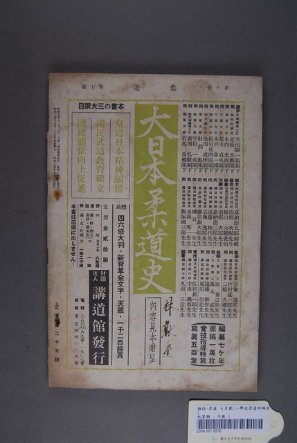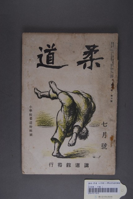 本物件為《柔道》七月號,紙質文物。該物件正面右上方可見「昭和五年□月二十二日第三種郵便物認可 每月一回一日發行」、「昭和十四年□月二十五日印刷納本 昭和十四年七月一日發行」、「第十卷 第七號」字樣。物件中間可見「柔道」、「七月號」、「講道館發行」、「小學校柔道特輯貌」字樣及1張2人正在進行柔道的插圖。物件內頁可見其目次包括「德なる哉」、「戰ひと平和と道義」...等標題,內頁可見該書發行兼編輯人為「野村寬一」、印刷者為「堀修造」、印刷所為「大日本印刷株式會社榎町工場」、發行者為「講道館」。