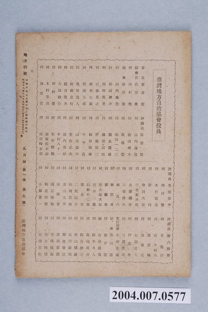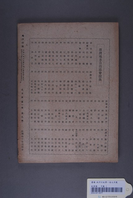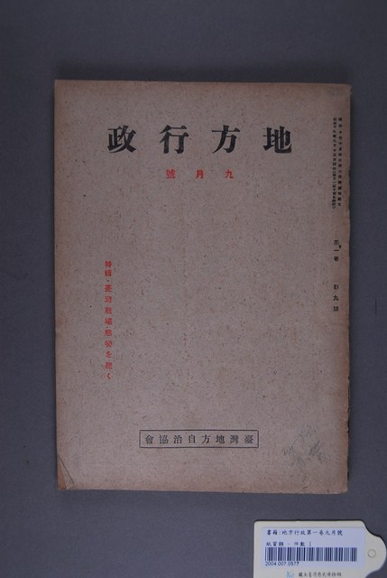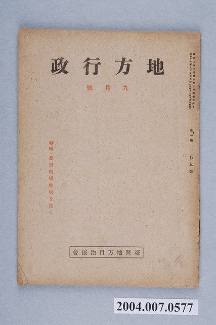 此為一紙質雜誌,為1944年(昭和19年)9月15日臺灣地方自治協會出版、中越榮二發行之《臺灣地方行政》雜誌九月號。 本物件的發行機構為「財團法人臺灣地方自治協會」,由地方自治機關與中央要員組成,為臺灣總督府所設置的諮詢、輔導機構,於戰爭期間也背負著政令宣導、精神動員等政治作戰功能。 此物件與日治時期的地方自治有關,日本政府於1895年接收臺灣之後,統治制度隨時局變化屢有更替。1919年起施行文官總督制,首任文官總督田健次郎致力推行「地方自治」制度,臺灣各地的地方行政組織漸次走向自治化,但在殖民地高度集權的法律制度下,地方行政組織的從屬色彩濃厚。受到一戰前後「大正民主風潮」、「民族自決」、「朝鮮三一獨立運動」等因素影響,臺灣的知識份子,在1920年代以社會運動的形式於臺灣各地倡導地方自治理念,並於1921至1934年發動多達15次的臺人赴東京國會請願活動。隨著地方政治制度改革運動的日益政治化,臺灣總督府終於1935年賦予地方行政機關法人地位,施行首次選舉、代議等自治措施。