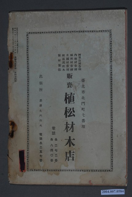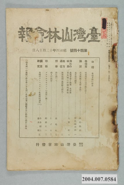 1.本物件為「臺灣山林會發行《臺灣山林會報》第四十四號」,是由伊藤太右衛門編輯、臺灣山林會發行的月刊。正面上方文字為刊名「臺灣山林會報」,下方為期數與出版日期「第四十四號、昭和四年十二月十八日」,中央為目錄,下方為發行所「社團法人臺灣山林會發行」,右上角的3行字則為報刊的印刷與出版日期等基本資料。內容為林業相關的論述文章。