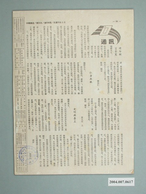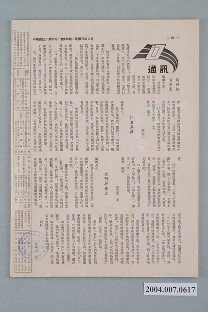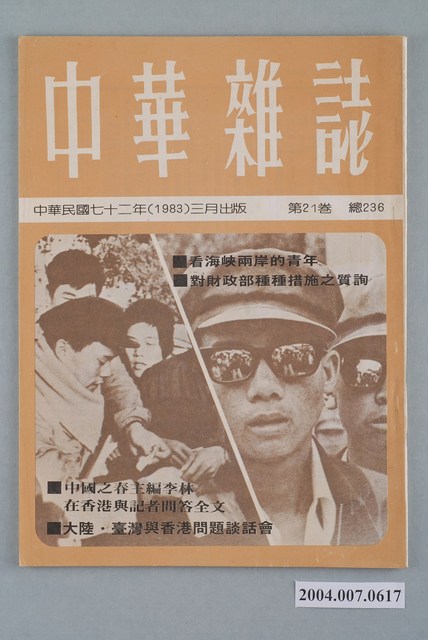 此為一紙質雜誌。此書為中華雜誌社1983年3月出版的《中華雜誌》第21卷總號236號。 此件為1963年創辦的《中華雜誌》,由胡秋原出資創辦。此雜誌的創辦原因為李敖於1962年在《文星雜誌》上發表文章掀起「中西文化論戰」,胡秋原因無相應的平台可以發表言論對抗,因此於1963年8月創辦《中華雜誌》。此雜誌的創辦人胡秋原生於1910年,為一臺灣作家,曾創辦《祖國》、《文化評論》、《民主政治》等雜誌,創作以領域以歷史、哲學為主,曾擔任聯合國中國代表團顧問、中國統一聯盟名譽主席,來臺後曾擔任臺灣師範大學、世新專科學校、政戰學校任教。 此件雜誌的創辦起因於「中西文化論戰」。在1961年11月胡適在「東亞區科學教育會議」上發表演說,並表達學習西方文化的重要性並排斥東方傳統文化,對此徐復觀與胡秋原都發表文章抨擊胡適的觀點,李敖則在1962年2月1日在《文星》雜誌上發表〈給談中西文化的人看看病〉,支持胡適的論點,認為學習西洋文化不可能取其精華,必須全部學習才能成功,並批判徐復觀及胡秋原,對此「中西文化論戰」全面展開,此「戰役」不僅是東西文化的對比,同時也是新舊世代理念上的衝突。