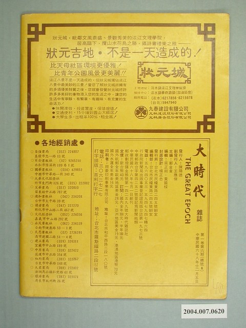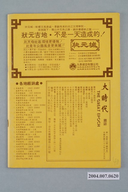 此件為《大時代》雜誌,為一政論雜誌,由原中國國民黨的臺藉教授陳陽德於1979年創辦。此雜誌的論述內容並不特別偏向黨外或是國民黨,甚至在「美麗島事件」中刊載匿名社論為被捕者做辯護。陳陽德原為國民黨籍人士,並參加《大學雜誌》,為國民黨內的改革派人物,後在東海大學教授政治學並加入「臺灣團結聯盟」。