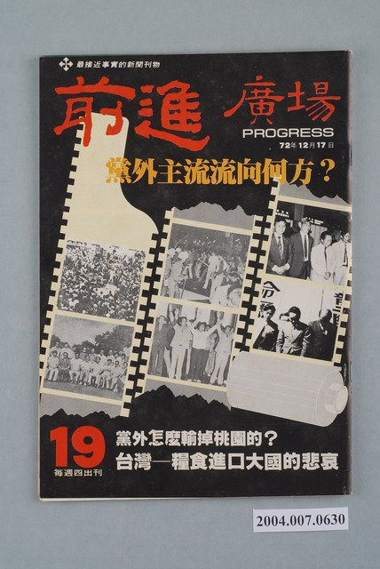 此為前進雜誌社1983年12月17日出版的《前進廣場》週刊第19期,內容計有〈黨外主流流向何方?〉(趙常)、〈黨外雜誌何去何從?-請運用小眾媒介與人際傳播展民主運動〉( 黃森松)、〈日本兩大報對台灣選舉的看法-朝日新聞:國民黨下次將遭逢更艱鉅的挑戰、讀賣新聞:新生代動向備受矚目〉( 王開譯)、〈黨外怎麼輸掉桃園的?-一次殘酷的經驗與教訓〉(耿榮水)、〈打不完的選戰-高李麗珍將提選舉無效之訴〉(吳祥輝)、〈猶抱「案情」半遮面-情治單位偵破「兩報」爆炸案內幕報導〉(治國)、〈台灣-糧食進口大國的悲哀〉(任覺民)、〈大陸人民首次海外旅行〉(閒雲)、〈比基尼與原子彈〉、〈核子武器-人類的公敵-一個歷史、政治、經濟與軍事的透視〉(林欣)等。 此物件為林正杰創辦的《前進》雜誌系列出版品之一。由於戒嚴期間的出版管制,《前進》面對警總的連番查禁,陸續更改刊名,計有《前進周刊》、《前進廣場》、《前進時代》、《前進世界》等。《前進》之創辦,以「在報禁下尋找更接近真實的客觀報導」為核心理念,其重要創辦人有林正杰、蔡式淵、蔡仁堅,三人皆為民進黨早期派系「前進系」成員。由於認同立場與民進黨在解嚴之後的路線相左,林正杰在1991年民進黨通過「臺獨黨綱」後宣布退黨,其所領導的「前進系」也隨之解散。 「黨外」一詞主要為非中國國民黨的臺灣政治勢力,而「黨外」政治勢力,主要的宣傳方式為「黨外雜誌」,「黨外雜誌」最早如1950年代的《自由中國》、1970年代的《大學》、《臺灣政論》,後在1980年代「黨外雜誌」發展蓬勃,代表刊物為《八十年代》與《美麗島》,最終,這股媒體趨勢在1986年民進黨成立、1987年解除戒嚴之後逐漸式微。「黨外雜誌」在當時激起了臺灣民眾的民主意識,也逐步促成了言論自由開放。(蕭淑玲,2006,153-155)。
