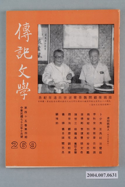 1.本件《傳記文學》第45卷第4期,出版於民國73年10月,封面以故國策顧問魏景蒙逝世兩週年紀念為題,以魏景蒙和時任行政院長蔣經國的合照為封面照片。此期的執筆人有卜少夫、吳相湘、沈雲龍、唐德剛等諸多名家。