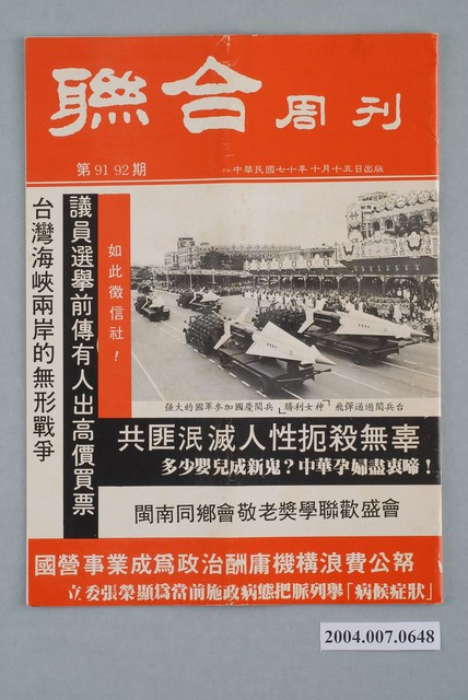 此為一紙質雜誌,此書為聯合周刊社於1981年(民國70年)10月15日出版的《聯合周刊》第91、92期。 《聯合周刊》於1979年由洪茂俊創辦的政論雜誌,此刊物的創辦主旨為「去偽存誠」,即為否定批著虛假外表的事物,並為人民及國家利益發聲,標榜「以國家為前提,以民意為依歸」 在1970年代至1980年代初的臺灣雜誌,由於外交危機的影響,相較於支持政府的主流政論雜誌之外,尋求改革的雜誌於是出現,其一是後來尋求黨內改革的《大學雜誌》,其二是醞釀黨外民主運動的《臺灣政論》。另外大型報社如《中國時報》、《聯合報》都挹注的雄厚資金,以《時報雜誌》、《中國論壇》投入雜誌出版的行列。文藝雜誌方面則有《夏潮》雜誌爆發「臺灣鄉土文學論戰」,並有數份以專業文學批評為主的雜誌創刊,如:《中外文學》、《文學季刊》等。另外社區雜誌以及婦女雜誌也在此時期發展起來。