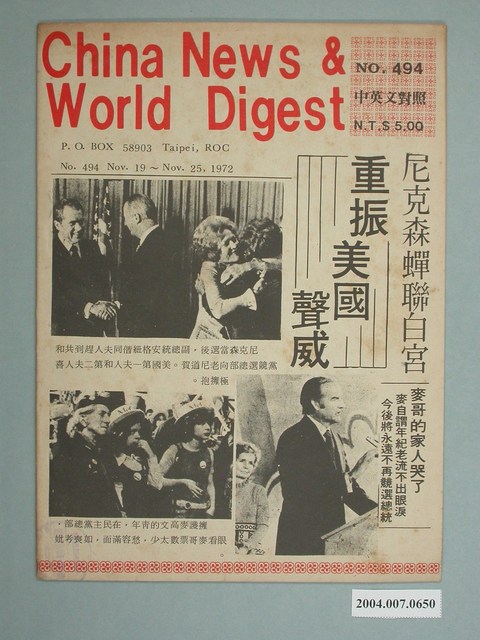 此為一紙質雜誌,在封面上方寫有本書標題以及出版日期,中央為本期雜誌的部份內容,左下方寫有本期雜誌期號,背面其餘雜誌內容及英文版標題。此書為香港報導社1972年出版的《香港報導》週刊第494號。 《香港報導》為一綜合性的新聞週刊,發行人為鍾樹楠。《香港報導》以港、中、臺三地的政經發展為主軸,亦引介國際情勢與潮流新知。 《香港報導》原名《香港週報》,於1963年8月10日創刊於香港,1965年4月1日起同時在臺北出版,1972年7月16日起擴大改為單行本。而後,在1973年8月更名為《中國報導》。