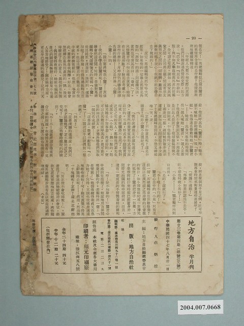 此為一紙質雜誌,此書為地方自治社1958年(民國47年)8月31日出版的《地方自治》半月刊第23卷第4期總號239號。 此刊物為《地方自治》,由翁鈐在1955年創辦。翁鈐為桃園人,生於1917年,在1947年擔任臺灣省政府民政廳副廳長,在1955年任地方自治協會理事長,並參與地方自治法規的修訂與推行,也於此時期創辦《地方自治》半月刊,以此刊物宣傳、評論地方自治政策,也發表地方上有有趣的事件。
