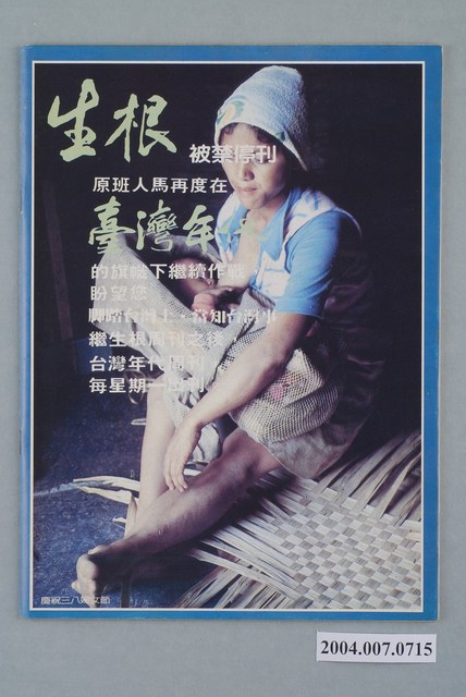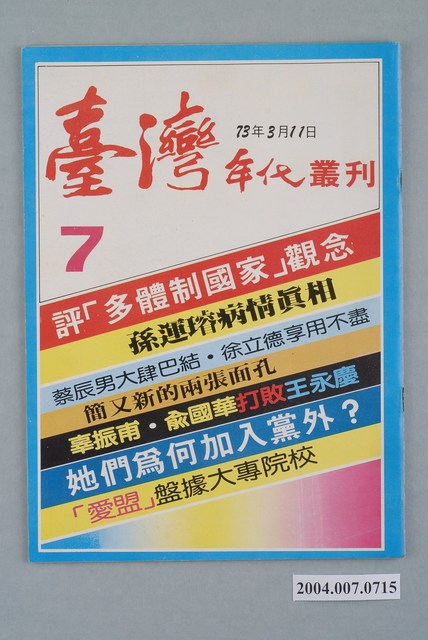 此為臺灣年代雜誌社1984年3月11日出版的《臺灣年代》叢刊第7期第51號,內容計有〈從鴕鳥到非牛非馬-評「多體制國家」觀念〉(劉明義)、〈國泰僑銀案留下的問題〉(沈向東)、〈「愛盟」盤據大專院校〉(阿山仔)、〈國民大會日記〉(林應專)、〈爲機車的路權請命〉(弄臣)、〈受不到社會關懷的女工〉( 江水涵)、〈世界的孤兒-庫德人〉(白藍帶)、〈王拓奔母喪〉、〈海盜王朝-東寗國〉(高伊哥)、〈她們爲何加入黨外?〉等。 此件為《深耕》雜誌的系列刊物之一,《深耕》為1981年由黃石城創辦的黨外政論雜誌,後交由許榮淑經營,主要主筆人包含林正杰、林世煜、林濁水等,其中內容包括編輯手記、國會趨勢、選舉與黨外動向、生活與政治、鄉土人物、藝文、漫畫等等。《深耕》曾在1982年對於「杯葛事件」中的部分黨外立委進行批判,並引起當時黨外勢力的對立。 「黨外」一詞主要為非中國國民黨的臺灣政治勢力,而「黨外」政治勢力,主要的宣傳方式為「黨外雜誌」,「黨外雜誌」最早如1950年代的《自由中國》、1970年代的《大學》、《臺灣政論》,後在1980年代「黨外雜誌」發展蓬勃,代表刊物為《八十年代》與《美麗島》,最終,這股媒體趨勢在1986年民進黨成立、1987年解除戒嚴之後逐漸式微。「黨外雜誌」在當時激起了臺灣民眾的民主意識,也逐步促成了言論自由開放。(蕭淑玲,2006,153-155)。