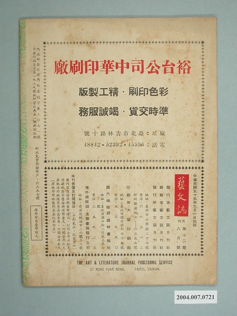 1.本文物為1966年藝文誌月刊社發行《藝文誌》第十二期八月號,期內容主要分成5部分,分別是人物傳記如〈革命報仇景梅九〉;燃犀新錄如〈北平「人代之花」范元貞〉;憶舊談往如〈北大紅樓人物逸事〉;河山攬勝如〈中國名山奇景(二)〉;藝文雅集如〈小楊月樓的劇藝與豔遇〉,諸多篇目共有16篇,除此之外還有徵稿啟示,跟該刊物之風格追求為「真實性、高尚感、風趣化與人情味」。