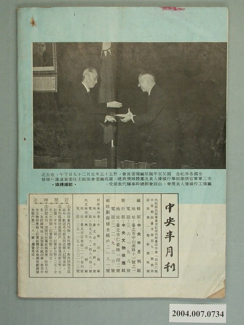 此為一紙質雜誌,此書為中國國民黨中央委員會於1966年(民國55年)2月11日出版的《中央》半月刊第315、316期,封面的照片左者為國民政府時期擔任主席的林森,又稱林子超,右者為蔣中正。 此物件《中央》半月刊為中國國民黨在臺灣發行的黨刊之一,此刊物可上溯至國民黨尚在中國時期就出版的《中央》半月刊,而來到臺灣後則因應過共內戰失敗而改名《改造》,而後於1952年改回《中央》半月刊,最終於1968年改為《中央》月刊。此刊物的內容大多為國民黨政治宣傳,曾發表三民主意思想、反共抗俄理念等宣傳,也協助塑造蔣中正的偉人形象,並曾在中華民國退出聯合國政局不穩時,邀集12位不同領域的大學院校學者發表以蔣中正「莊敬自強」口號為題的言論,藉此安定民心。