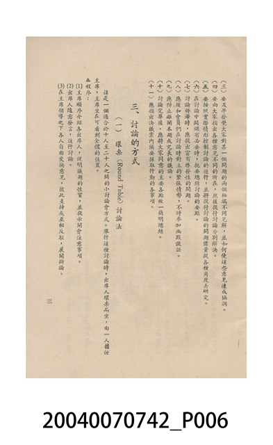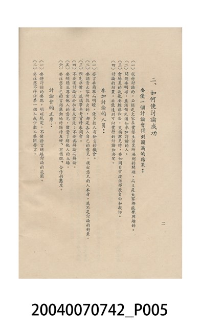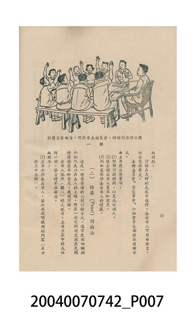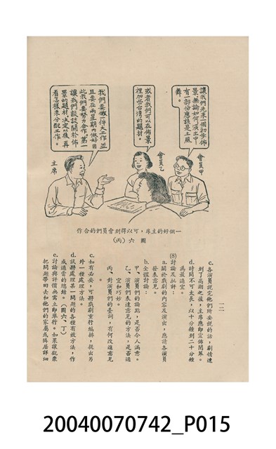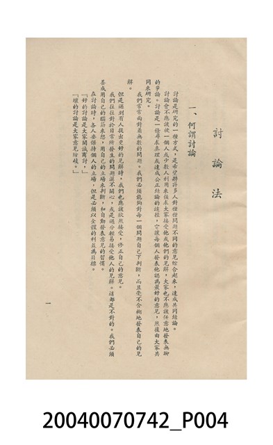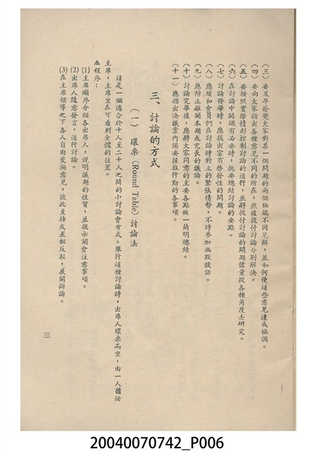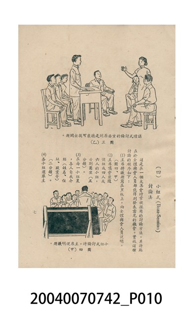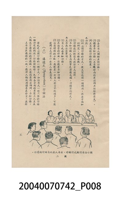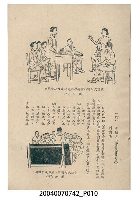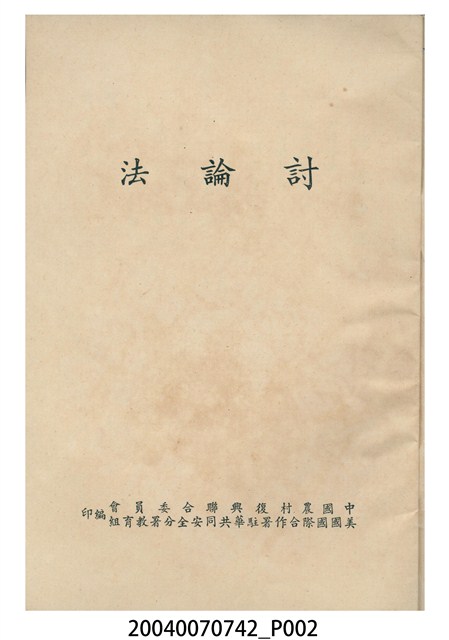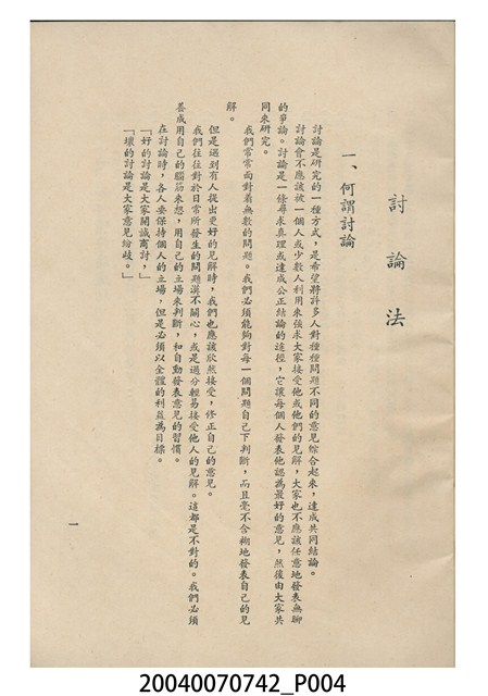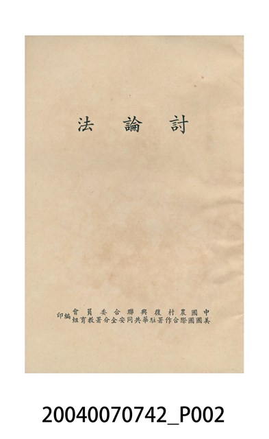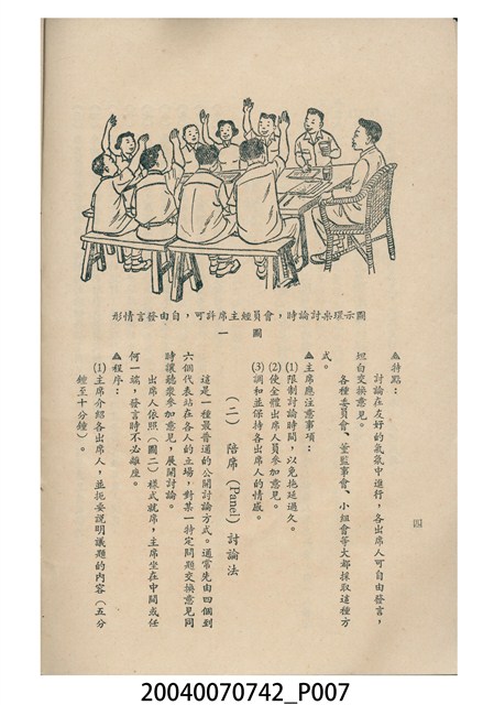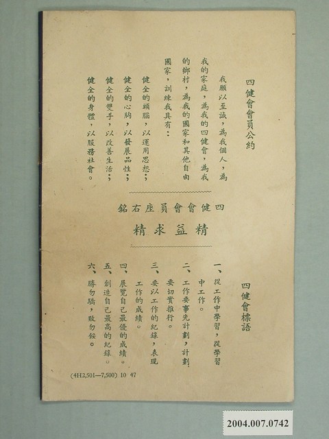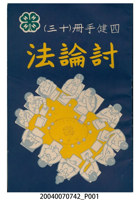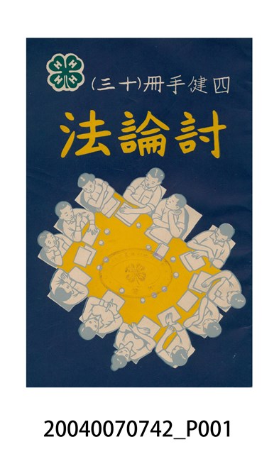 1.本物件為「四健手冊(十三)討論法」,為中國農村復興聯合委員會與美國國際合作署駐華共同安全分署教育組編印的四健會手冊,正面上方為書名「四健手冊(十三)、討論法」,左上方是四建會的圖案,為一個綠色四葉幸運草、葉片上則各有一個英文字母「H」,背景圖案為藍色,中央為幾名青年圍坐在黃色長方形桌子討論的模樣。內容為「討論法」的說明與各種討論方式的介紹。背後為四健會的會員公約、座右銘與標語。