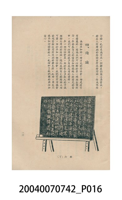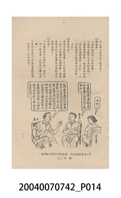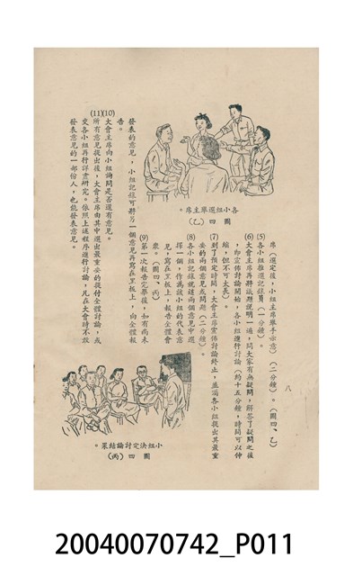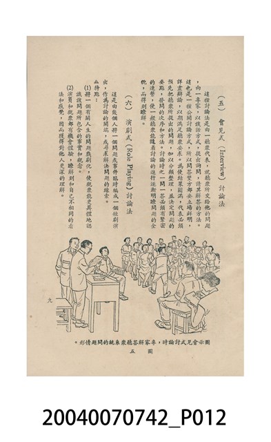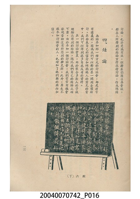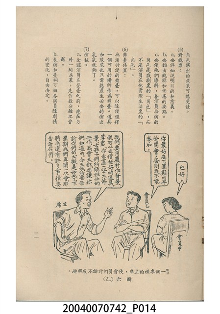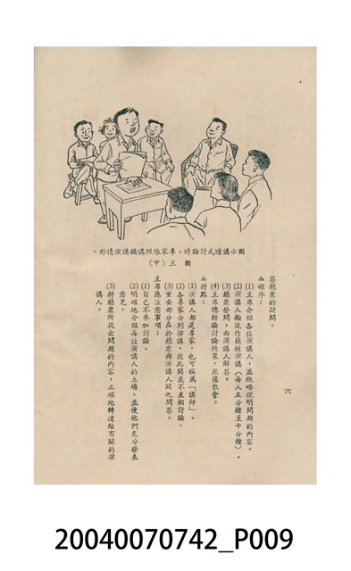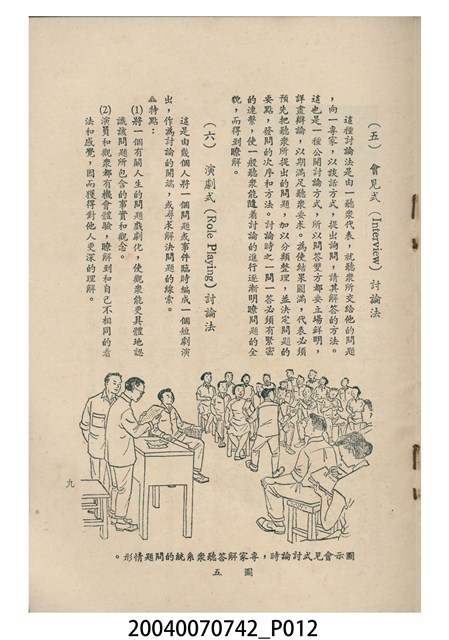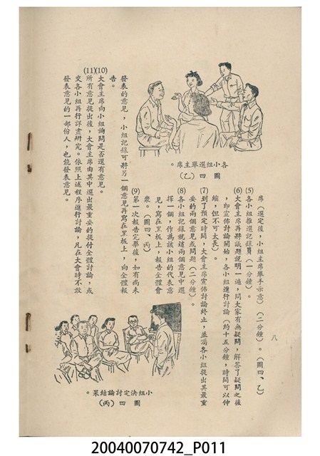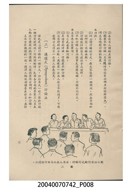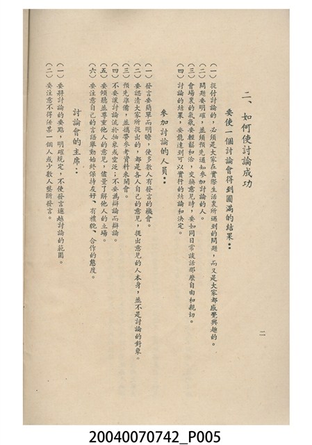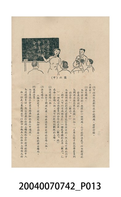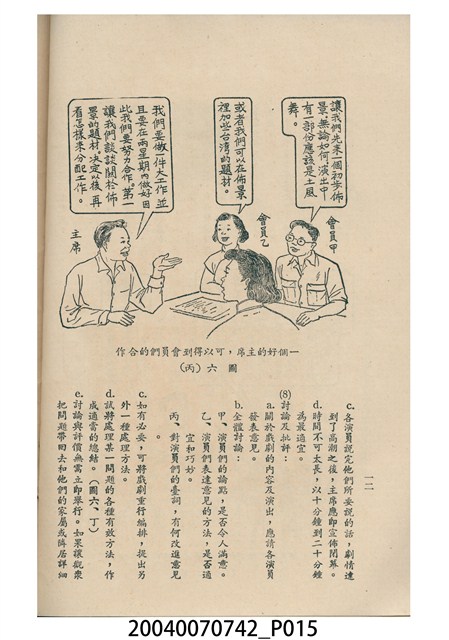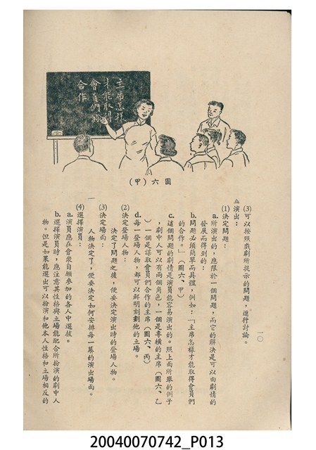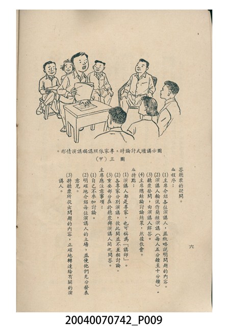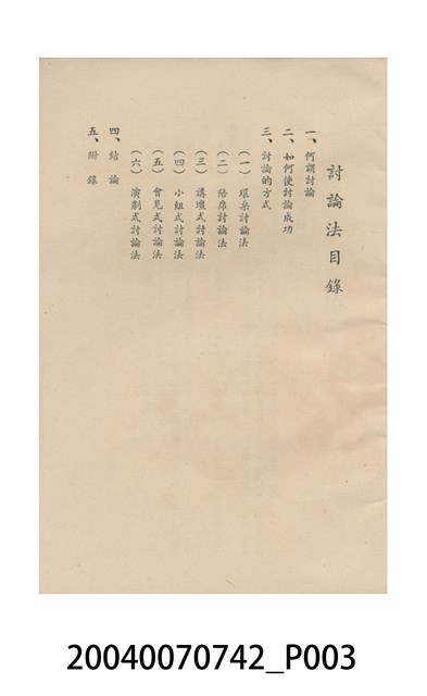 1.本物件為「四健手冊(十三)討論法」,為中國農村復興聯合委員會與美國國際合作署駐華共同安全分署教育組編印的四健會手冊,正面上方為書名「四健手冊(十三)、討論法」,左上方是四建會的圖案,為一個綠色四葉幸運草、葉片上則各有一個英文字母「H」,背景圖案為藍色,中央為幾名青年圍坐在黃色長方形桌子討論的模樣。內容為「討論法」的說明與各種討論方式的介紹。背後為四健會的會員公約、座右銘與標語。