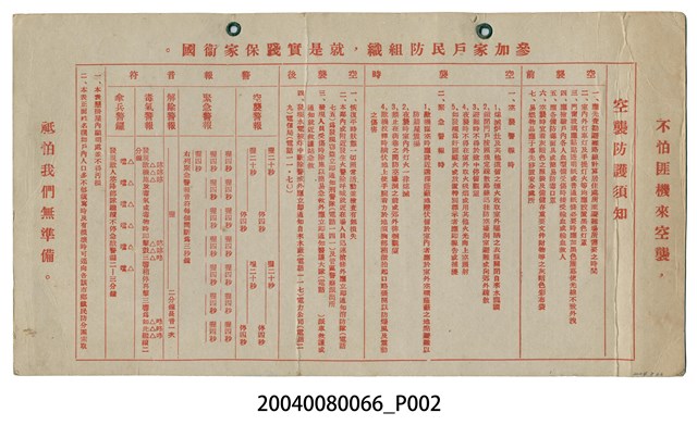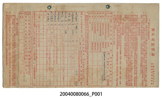 本物件詳述家戶民防的編組目的、組織構成、任務以及訓練內容,並填載當時一家中的人員編制以及所備之器材,另一面印有宣導遇到空襲時所注意的相關內容。於1955年(民國44年)7月嘉義縣民防指揮部所製作之資料卡。