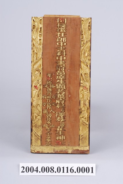 神主牌是家屬奉祀已逝親人的牌位,神主牌上所雕紋形有規制,官宦之家會雕龍形紋,平民百姓只能雕梅花與雀鳥。本件木雕葉澤芬神主牌,正面上方與兩側雕龍紋,上方中間雕有立牌,中間寫「皇恩」兩字,神主牌全名「例授微壁錕中書科中書府吧庠生顯考葉府君章澤芬諱芷生神主」左下方有「孝男德裕文孫作舟城楫作元哲亨作人壽曾孫求仙長等仝立奉祀」等字,文字與周邊花紋漆金色漆,外觀老舊,保存完整。