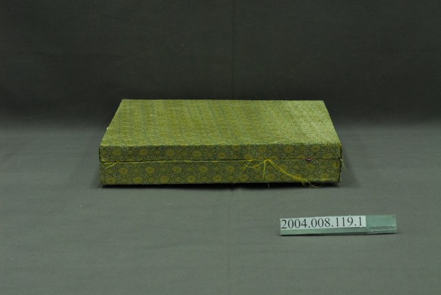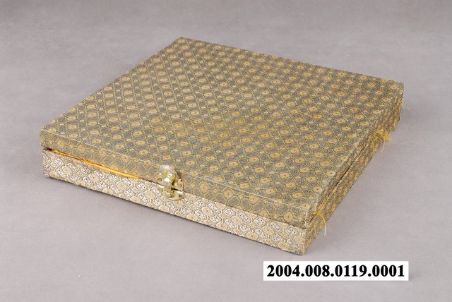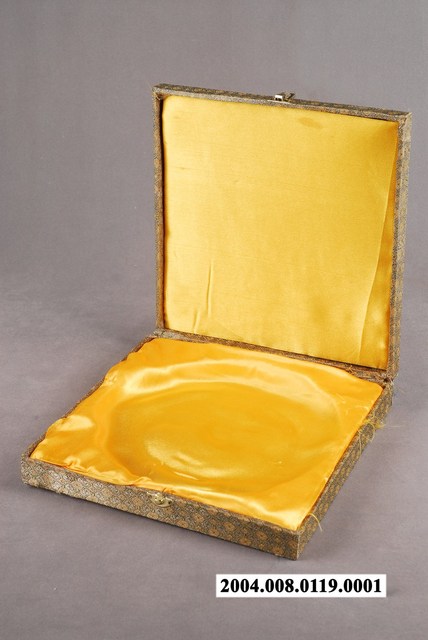 1.金錢紋錦方盒為上掀式的盒款,上蓋較薄,盒子主體稍厚,鎖頭為一般的上掀式五金。錦盒使用綠地金色金錢紋的錦布包覆,可能經久布料彈性鬆弛導致表面花紋歪斜。內襯金黃色緞面布料,並依據盤子的形狀與大小預留位置,讓器物在盒內為安穩、固定式地收納。2.此種囊匣雖為器物的配角,除了襯托出主體器皿的存在之外,精心製作的錦盒更能凸顯器皿之華貴。錦盒除了對於保護器物的安全上有其必要性之外,也提供了視覺上的觀賞趣味。