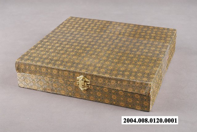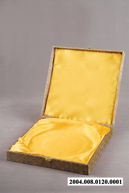 1.金錢紋錦方盒為上掀式的盒款,上蓋較薄,盒子主體稍厚,鎖頭為一般的上掀式五金。錦盒使用綠地金色金錢紋的錦布包覆,可能經久布料彈性鬆弛導致表面花紋歪斜。內襯金黃色緞面布料,並依據盤子的形狀與大小預留位置,讓器物在盒內為安穩、固定式地收納。2.此種囊匣雖為器物的配角,除了襯托出主體器皿的存在之外,精心製作的錦盒更能凸顯器皿之華貴。錦盒除了對於保護器物的安全上有其必要性之外,也提供了視覺上的觀賞趣味。