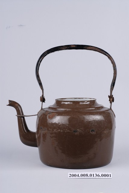 2.此種類型水壺又稱燒水壺,也稱熱水壺,主要是用於煮水的容器,多為陶瓷或金屬製作,它是庶民生活用品的一環,民間水壺功能主要是裝飲用開水和青草茶,外表常是小口、圓身大腹、平底,有壺嘴、壺蓋、提把,並上以褐色與茶色的釉,以實用機能為訴求。日治時期從日本進口鐵製或銅製水壺,平底,壺形扁圓,把手纖細,壺嘴短小,蓋上有圓鈕繫繩方便提鈕,1940年代風行鋁製的水壺,1960年代以後盛行不銹鋼與琺瑯水壺。