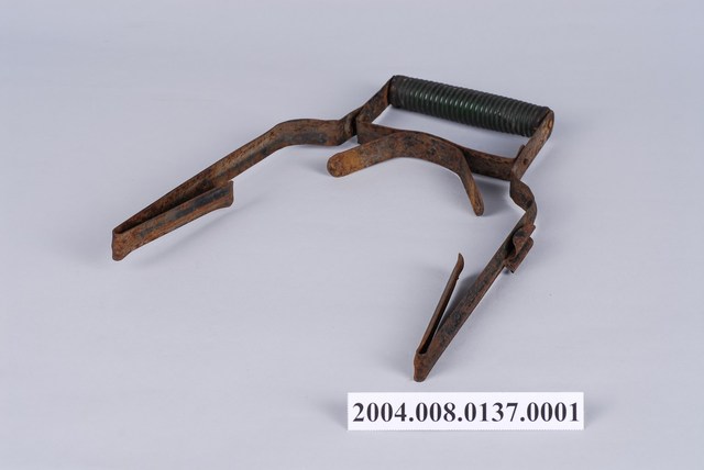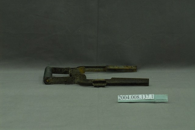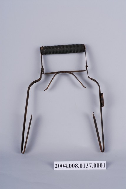 搪瓷材質提鍋式飯菜盒的提框架部分,鐵製材質,大致呈現ㄇ字形。上部以鉚釘進行接合,提框手握把部分為木頭材質,表面環形紋路可增加拿取時的摩擦力;手把下方橫桿部分的弧形結構是用來壓住整個提鍋的上端,以使其緊密接合,不至讓湯汁流出;下部左右兩框條部分向內凹折,以便套進食盒的雙耳中,其中一框條附有可插入筷子的裝置,是相當貼心的設計。因年代久遠,已呈現嚴重銹蝕的狀態。