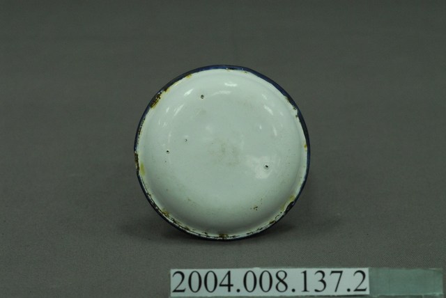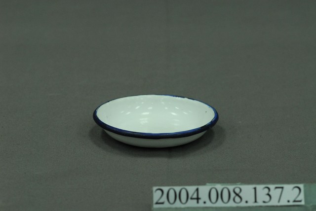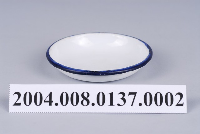 搪瓷材質提鍋式飯菜盒的小碟部分,主體為白色搪瓷材質, 口緣處以藍色塗料飾之,整體看來相當素雅。小碟的碟面口徑與飯碗的圈足相同,使其相互扣合;底部的孔洞是琺瑯製品上常見的現象。因年代久遠,藍色口緣的上下部分都呈現凹凸銹蝕的狀況。小碟的用途除了方便食用者將料理從食盒中取出另外放置外,也可用來放魚刺、骨頭、醬料等。