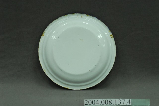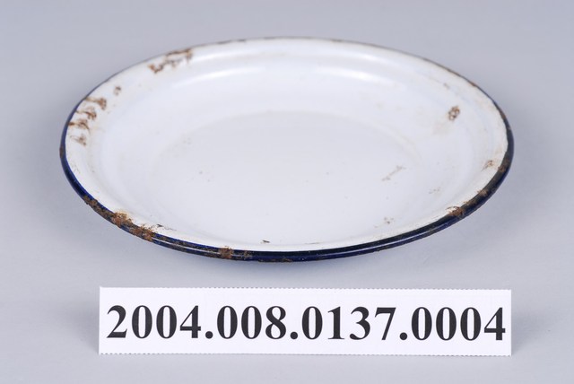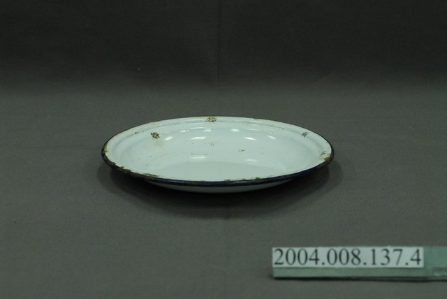 搪瓷材質提鍋式飯菜盒的大碟部分,主體為白色搪瓷材質, 口緣處以藍色塗料飾之,整體看來相當素雅。大碟碟面的環形收折處口徑與飯碗的口徑相同,可使其相互扣合。因年代久遠,藍色口緣的上下部分與碟面處多有呈現凹凸銹蝕的狀況。大碟的用途除了方便食用者將料理從食盒中取出另外放置外,也可用來放魚刺、骨頭等。