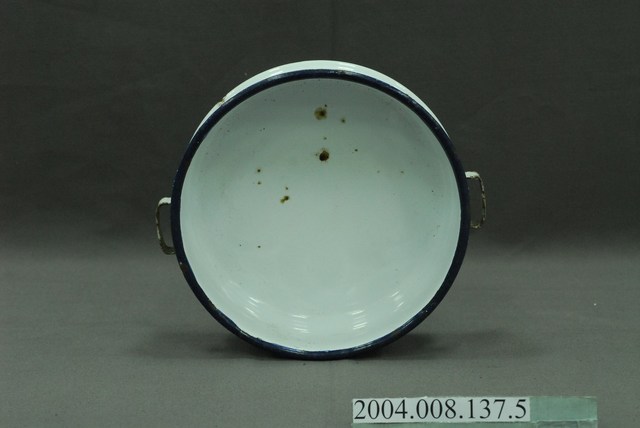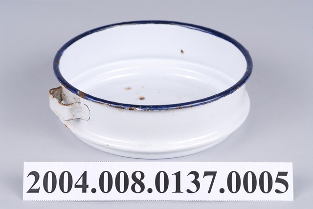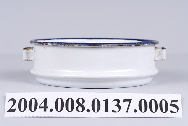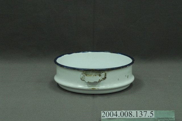 搪瓷材質提鍋式飯菜盒的上層食盒部分,主體為白色搪瓷材質, 口緣處以藍色塗料飾之,整體看來相當素雅。食盒的口徑與大碟的碟緣口徑相同,可使其相互扣合;食盒食盒下方的外凸環狀結構是為了要與下方另一個食盒口緣相互扣合的設計。因年代久遠,食盒內外部、藍色口緣的上下部分、用來套掛提框架的雙耳部分都呈現凹凸銹蝕的狀況。該層食盒可彈性調整用來裝盛菜或飯。
