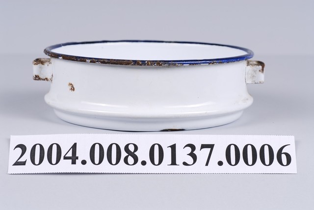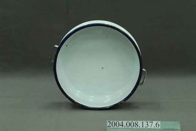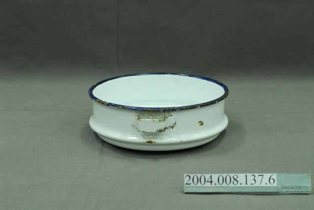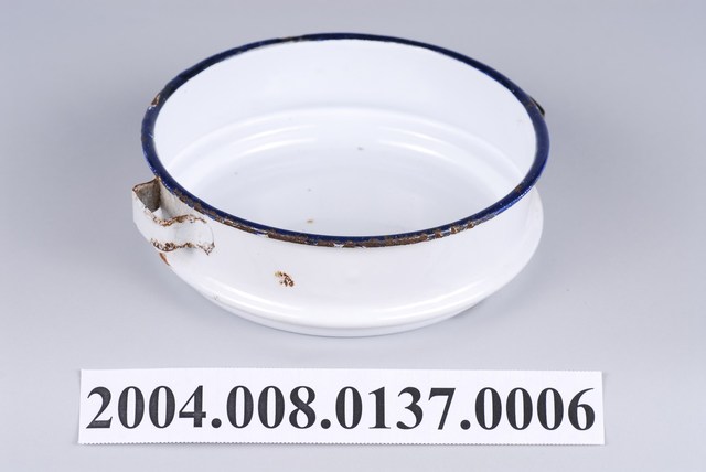 琺瑯材質提鍋式飯菜盒的中層食盒部分,主體為白色搪瓷材質, 口緣處以藍色塗料飾之,整體看來相當素雅。食盒口緣處可與上層食盒的外凸環狀結構相扣合,下方的外凸環狀結構是為了要與下層另一個食盒口緣相互扣合的設計。因年代久遠,食盒內外部、藍色口緣的上下部分、用來套掛提框架的雙耳部分都呈現凹凸銹蝕的狀況。該層食盒可彈性調整用來裝盛菜或飯。