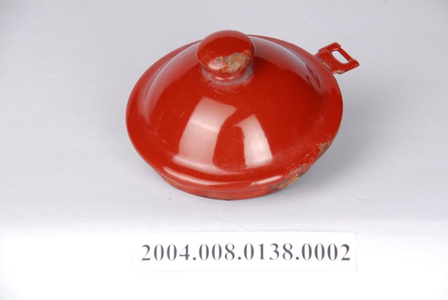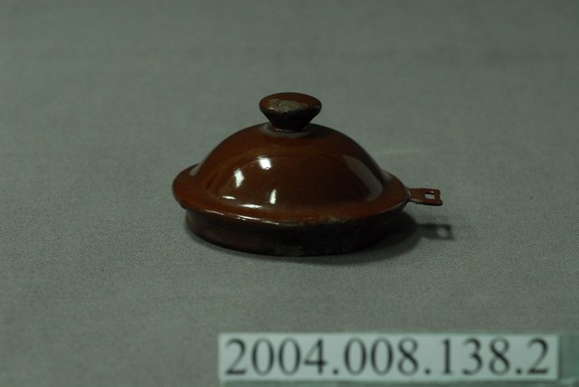 1.本物件為小型褐色鐵製水壺蓋,壺蓋為圓型,上方有一凸起,方便拿取,水壺蓋邊緣有生鏽現象,其他地方也有些微破損,壺蓋上的褐色漆至今仍透亮能反光。