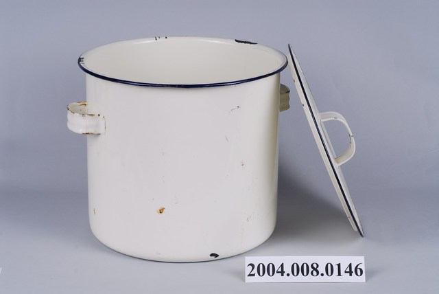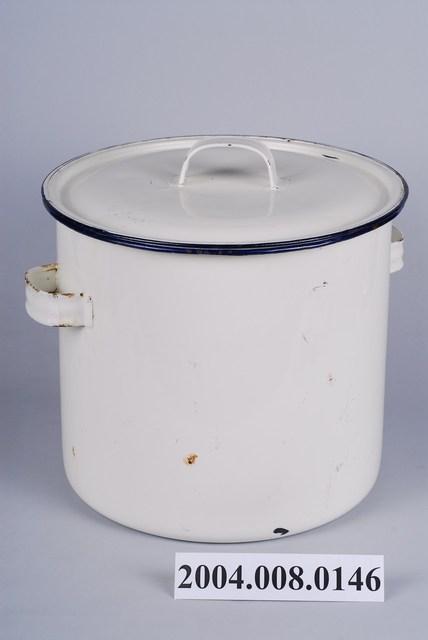 1.本件為搪瓷材質鍋具,容量相當大,可分為鍋蓋與鍋身2部件。整體材質為鐵胎,外部施以白色琺瑯燒製而成,主要用來烹煮食物之用,鍋口與鍋蓋邊緣處以藍色塗料飾之,整體看來相當素雅。2.搪瓷又稱為琺瑯,是指在金屬表面以玻璃質之材料塗層,再進行高溫窯燒之技術。由於熱傳導性高,保溫性優異,抗強酸、強鹼,因此非常適合製作成燉煮鍋;唯在口緣、把手處內部等邊緣處,或是在燒製過程中做為垂吊處的頂部等,釉較不容易附著,也因此可能產生色料脫落或上色不均勻的狀況,若因碰撞或外力衝擊造成表面玻璃質脫落,內部的黑色釉會顯露出來,嚴重