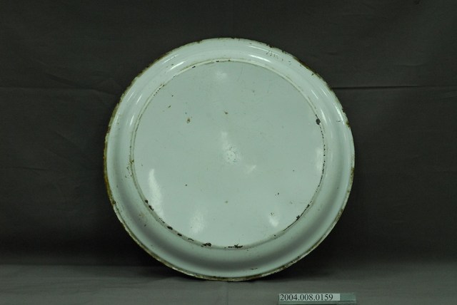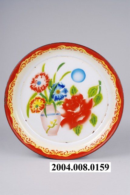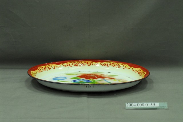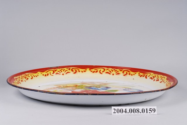 1.花卉紋搪瓷大圓盤,圓形、折沿、圓弧腹、平底淺盤,口沿略向上凹起後往外向下內捲作圓弧邊,盤面一圈環形下凹於盤底凸出作圈足狀,直徑約40.1公分,高約4公分,為形制較大的圓盤。以鐵金屬為胎,表面塗有白色瓷釉,凹折處部分瓷釉剝落,露出鐵金屬表面,有些已氧化呈鐵鏽色。口沿塗一圈深藍色釉,盤沿裝飾一圈紅色釉並印有花邊,盤面環形下凹內右方裝飾一朵大紅牡丹花,左方為瓶花圖樣,花瓶上有水波紋與枝頭小花裝飾,瓶中插紅、黃、藍三朵花襯綠色葉片,可能為康乃馨之類的花朵,右上方一顆漸層藍色圓點裝飾。背面盤底素面無紋,中央印有一圓形落款,字樣模糊難以辨識,圓圈內部為3顆星星圖樣,推測為三星牌產品。2.搪瓷是指將玻璃或陶瓷質粉末熔合後塗在金屬製品的表面上,有防止氧化及裝飾的作用。搪瓷製品具有硬度高、耐酸鹼、易清洗的優點,在1960至1970年代曾被廣泛應用於日常生活中的飲食器具,後來因塑膠、鋁製品、不鏽鋼等價格低廉耐用的產品推出,搪瓷用品才逐漸被取代。
