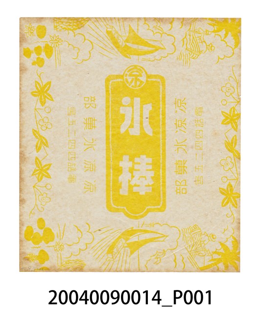 1. 涼涼冰果部冰棒包裝紙,方形不透水、半透明油紙材質,黃色單面油墨印刷。中央長方框內以棕色圖彩印製出內容物「氷棒」名稱,長方框上下端皆有圓框造形,上端印有「涼」字。方框兩側為販售者的店名「涼涼氷果部」與電話「電話四四二五号」。周邊飾以花草與人物景色等圖案,左右端邊緣處為簡易花草紋,上下端邊緣處由右至左分別為:雲朵、椰樹與雙人划船;雲朵、海鷗與風帆船;雲朵、垂柳與蓮池。整體圖像設計相當具有夏日風情與涼爽感。保存狀況完整,但因年代久遠,整體呈現泛黃狀態,四周邊緣處嚴重泛黃,右半部有多處壓褶痕跡,右端邊緣處有些微破裂情況。2. 早期冰棒包裝各店家有些微差異,但多半是將冰棒置於中央,左右兩邊交錯包覆冰棒後向內折入;冰棒上端多出的包裝紙部分,沿著冰體伏貼壓摺或扭轉壓摺,下端連結木棒處則是纏繞扭轉壓摺。3. 臺灣於日治時期即有製作冰品的商家,由於成本低,製作方法簡單,銷售對象不分老少,故而有「第一好作冰 第二好作醫生」的俗語。正因為臺灣地處熱帶、副熱帶氣候區,加上盛產蔗糖,民眾多愛吃冰品,因此早期發展出許多冰果室與自家風味的冰品,此類包裝紙便是自動化包裝未普及前常見的樣式。