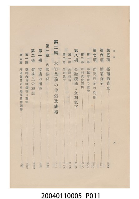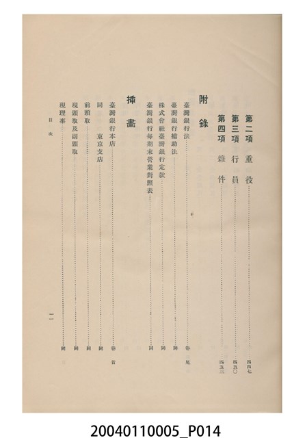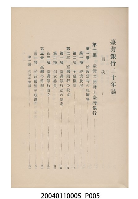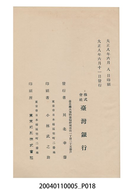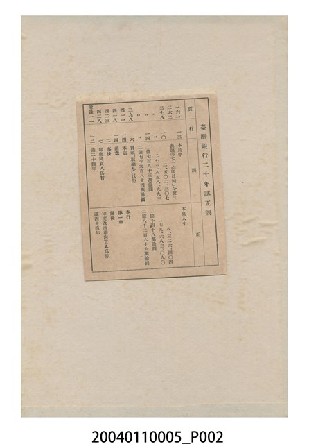 1.本物件為株式會社臺灣銀行發行《臺灣銀行二十年誌》,為紙質,呈方形,為書籍,封面為深綠色,並有「臺灣銀行二十年誌」金色字樣,封底無圖案字樣,其內容為紀載臺灣銀行設立至今20載間大小異動,共分為3編,第1編為臺灣の開發と臺灣銀行,其下分為始政當時の經濟界、臺灣の設立、臺灣の幣制、大租權補償、財政と國庫、臺灣經濟界の發達、金融共7章,第2編為本行業務の伸張及成績,其下分為內國關係、外國關係、本行の事蹟共3章,第3編為本行の內部關係,另本書尚有附錄、插畫、表格與地圖,發行者為川北幸壽,印刷所為東京印刷株式會社。