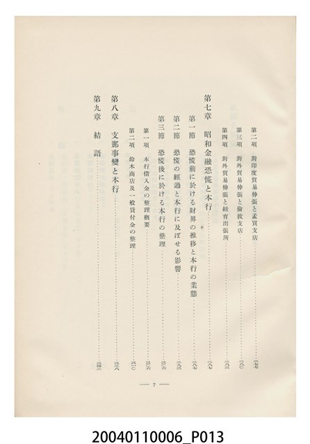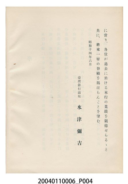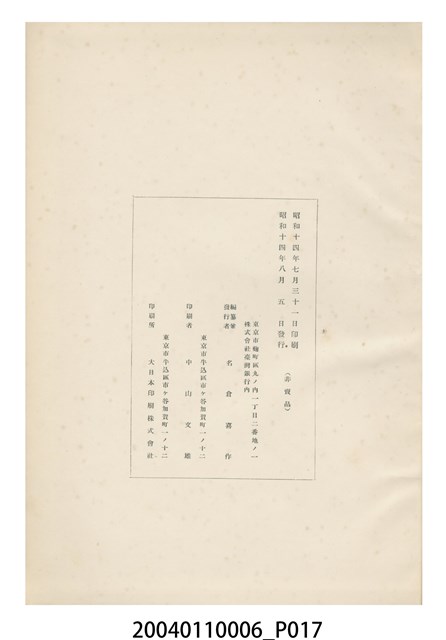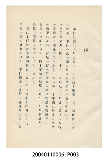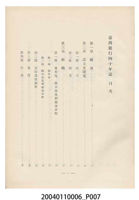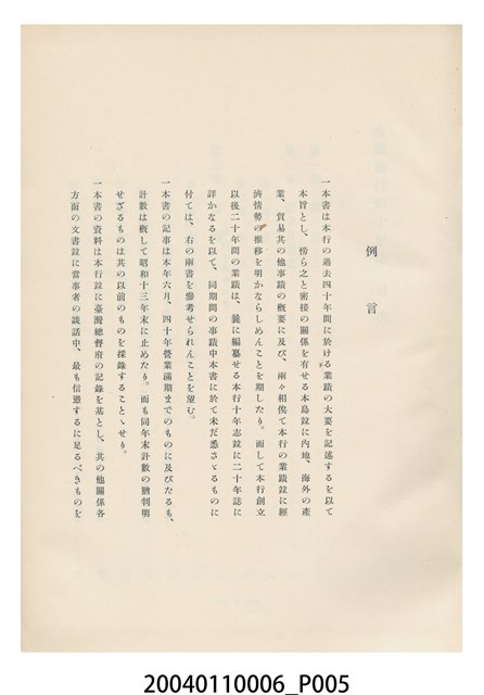 1.本物件為名倉喜作著《臺灣銀行四十年誌》,為紙質,呈方形,為書籍,封面為深藍色,與封底同無圖案字樣,封面翻開第1頁則有「臺灣銀行四十年誌」黑色字樣,其內容為紀載臺灣銀行設立至今40載間大小異動,其分為總說、設立及開業、組織、業務、臺灣に於ける業績、內地及海外に於ける業績、昭和金融恐慌と本行、支那事變と本行與結語共9章,另有附錄、圖表及寫真,編篡及發行者同為名倉喜作,印刷所為大日本印刷株式會社。