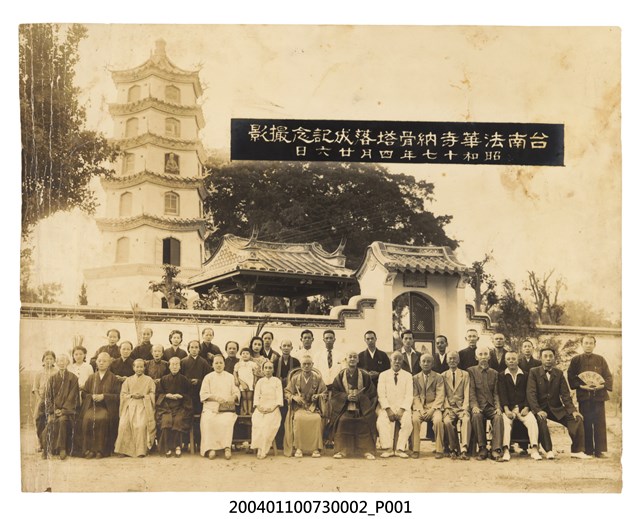 1.本物件為昭和17年(1942)4月26日臺南法華寺納骨塔落成紀念攝影,照片中共有35人合影,有15位為身穿袈裟的和尚與尼姑,第1排右1男性應為王汝禎,其他成年男性大多數身穿西裝。據昭和19年(1944)重修法華寺三十週年紀念碑記記載,法華寺曾於大正3年(1914)、大正7年(1918)與昭和15年(1940)重修,王汝禎於昭和15年(1940)營建納骨塔及男女客堂。由此推斷納骨塔應歷時2年修建。此文物邊緣有皺褶現象,照片表面有汙跡。