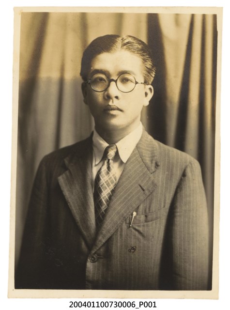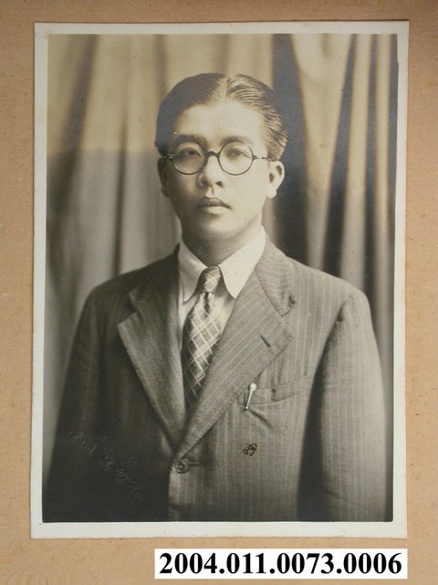 1.本物件為王育霖黑白照片,其穿著西裝。據王育霖拍攝時的神情與姿態判斷,此照片應在相館所拍攝。本文物紙質泛黃。