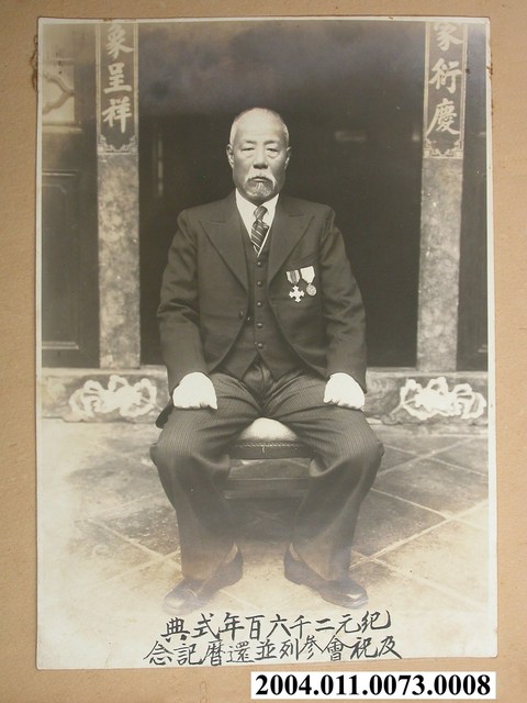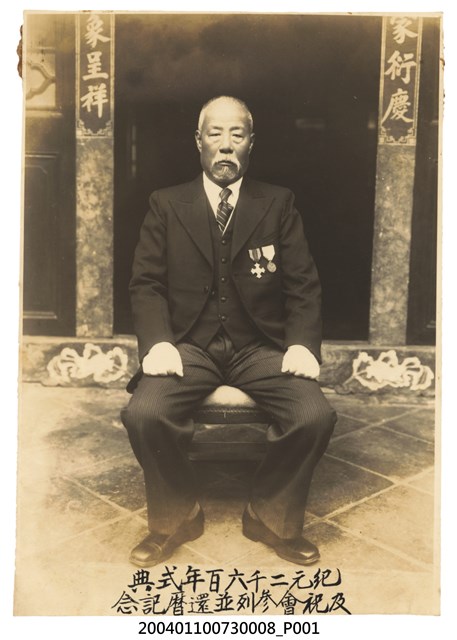 1.本物件為昭和15年(1940)王汝禎的黑白照片,照片場景為金義興商行王宅前,王汝禎穿著正式服裝,並配戴勳章。照片下方文字為「紀元二千六百年式典及祝會參列並還曆記念」,還曆、別稱為還甲、回甲、花甲等,指人的年齡滿60虛歲,意即六十甲子。王汝禎生於明治13年(1880),當年紀元2600年(1940)王汝禎的年歲是一甲子,對於王汝禎而言是人生中重要階段,故拍攝「還曆記念」此一紀念照。本物件紙質泛黃。