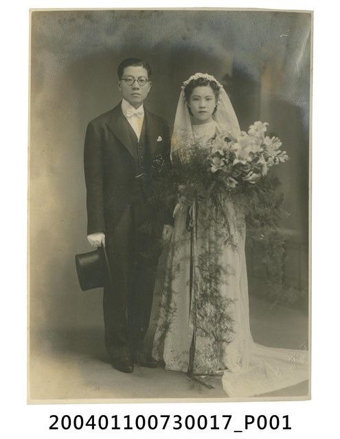2.日治初期,臺灣人受殖民文化的影響不深,結婚服飾仍舊維持原有的漢式傳統樣式。到了日治中期,日本自明治維新以來將其所吸收的西方文明大量傳入臺灣,結婚禮服有了重大的改變,新郎改穿西式的黑色禮服、頭戴禮帽,新娘改穿及膝洋裝或裙擺及地的白色西式禮服,手持捧花、頭戴白紗。不僅在樣式上全盤西化,在顏色方面也顛覆了傳統所認定的喜慶色系。