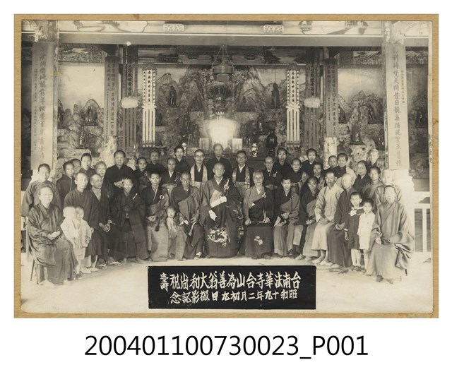 1.本物件為昭和19年(1944)為法華寺合山為善翁大和尚祝壽時所拍攝的紀念照片,為黑白照片。照片合影人物皆為和尚或尼姑,包含5名幼童。中坐者應為合山為善翁大和尚,其身穿袈裟,手持法器。據照片背景判斷,拍攝地點應位於法華寺觀音殿內。本文物紙質泛黃。