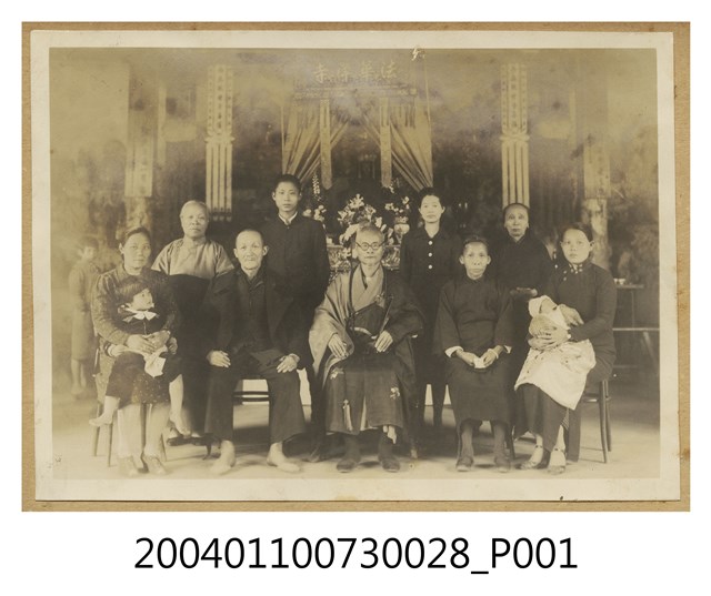1.本文物拍攝地點為臺南法華寺內,共有11人一同合影。照片中坐者為1位為身穿袈裟的和尚,其餘合影人大多數為女性,第2排右1的女性應為王汝禎之妻。本文物紙質泛黃且褪色。