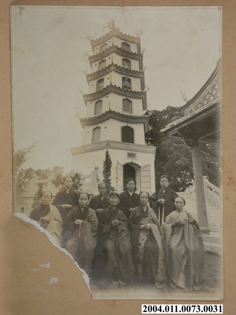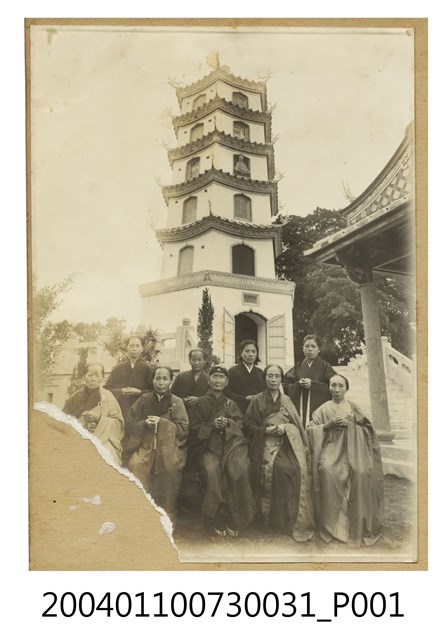 1.本文物場景與2004.011.0073.0002文物相同,拍攝地點為臺南法華寺納骨塔前,年代推斷應為昭和年間。照片中共有9位身穿袈裟的尼姑一同合影。本文物紙質泛黃,照片左下角有嚴重破損。