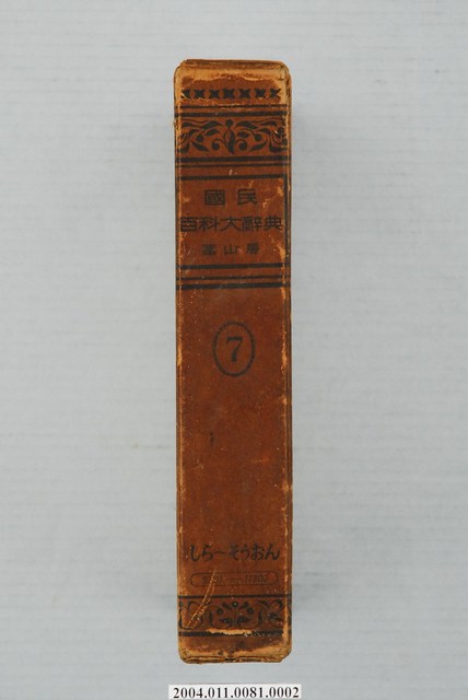 本文物為厚本精裝書籍,書名為日文《國民百科大辭典》,由日本富山房百科辭典編纂部編纂,東京神田區富山房發行,於昭和十年(1935)至昭和十四年(1939)間出版,全套12冊,暗紅色書皮,書背與書角均有金線修飾,每一卷均有完整紙盒封套。本文物為第七卷之封套。