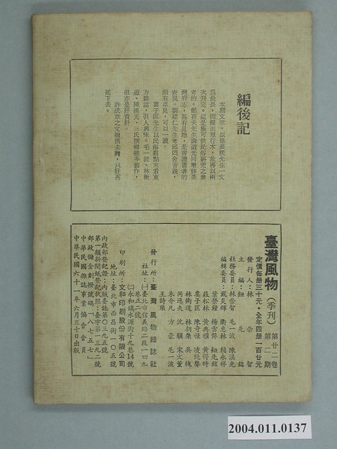 1.本件為《臺灣風物》季刊第22卷第2期,出版於民國61年6月30日,由鈕先銘主編。2.《臺灣風物》創刊於1951年12月,由陳漢光發起成立,陳自兼發行人,楊雲萍任主編,宋文薰、曹永和、賴永祥等協助編輯。該刊物是由楊雲萍命名,以民俗習慣的採集紀錄和隨筆為主,鼓勵當時民間研究者,共同參與。由於作者群繼承了《民俗臺灣》的精神,使得風物也承繼《民俗臺灣》的特色,扮演香火傳承角色,架起日治時代民俗研究和戰後臺灣研究的橋樑。1970年代末期轉型為學術性刊物。