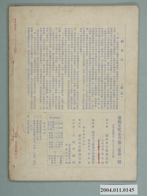 1.本件為《臺南文化 》第2卷第1期,民國41年1月由臺南市文獻委員會發行,本期為臺灣宗教與民俗特輯,以赤崁樓為封面底圖。2.《臺南文化 》在民國40年10月創刊,發行至民國61年6月,第9卷第3期停刊。民國65年6月復刊,期數另起。該刊刊載臺南市沿革有關之府廳州縣各種舊志書及各項地圖,詩文著述及金石拓片,流傳之典禮樂器民俗歌謠,重要及特殊文物之照片與撰著,地方掌故、古蹟文物、名人傳記以及重要史實等文化研究文稿。