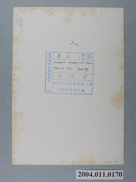 本物件為何懷東攝影作品老人。物件本體為一張直式黑白照片,影像滿版無留白色邊框。圖像中特寫一位蓄鬍老人的胸上側面半身,詳盡呈現老人臉上歷經風霜的皺紋。物件背面有題名、編號、攝影記錄、姓名、地址等資料欄位,清楚寫有攝影者為何懷東,及其拍攝此張照片時使用的攝影模式等資訊。在欄位上方用鉛筆標示一個「入」字;在「入」字左上方寫有「1-152」的數字編號。